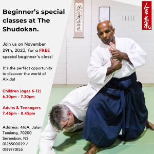 SPecial beginner’s class @the Shudokan SPECIAL BEGINNER’S CLASS The Shudokan, the first Aikido dojo in Malaysia, has been a place to learn the Yoshinkan style