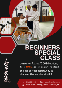 2024 Beginner’s special class We are thrilled to invite you to our FREE beginner’s Aikido class on August 17th at 6 PM! This is the